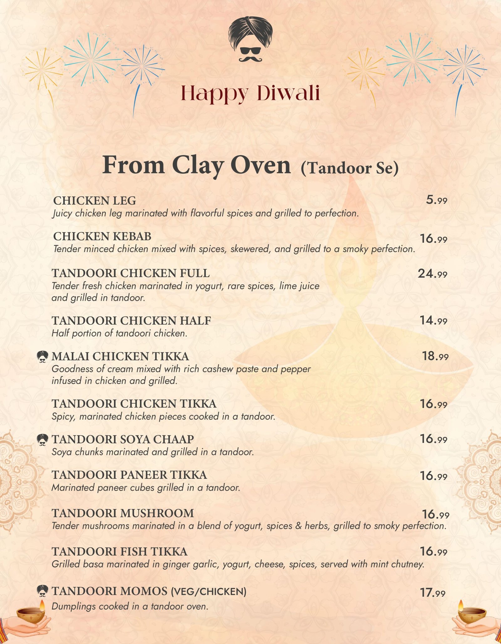Tender fresh chicken marinated in yogurt, rare spices, lime juice and grilled in tandoor.